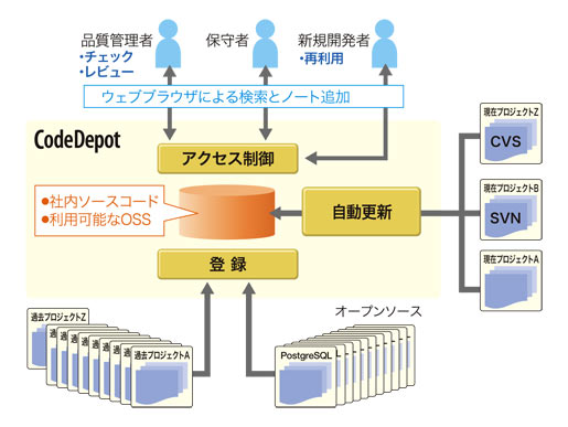 開発・保守中のプロジェクトのバージョン管理システムと連動し、コードの自動登録・自動更新が行えます。