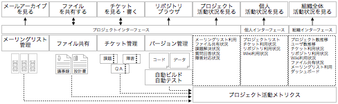 ProjDepotでは、バージョン管理やチケット管理機能、メーリングリスト機能などにより蓄積されたデータからメトリクス情報として自動的に収集し、それらの情報の時間的な変化をインタラクティブなグラフで表現します。