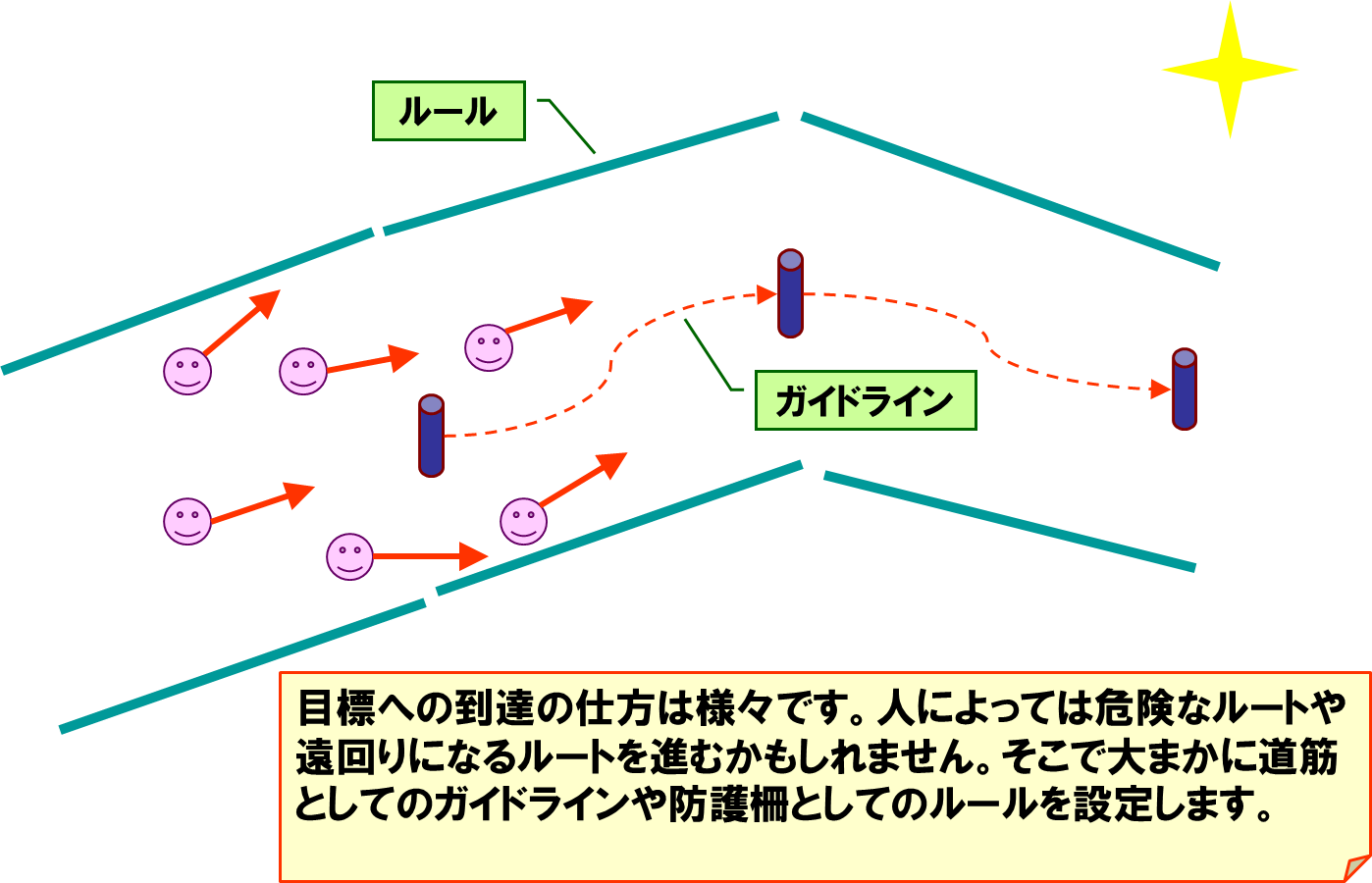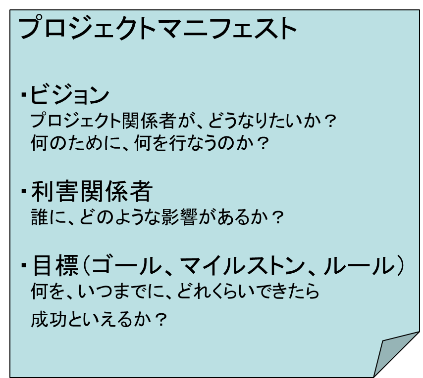 チーム全員で、プロジェクトの構想・目的、利害関係者、目標を共有します。 チームで議論を重ねて、「なぜ」「何を」「誰のために」「いつまでに」「どのくらい」開発するのかを合意します。 チームは、自分たちで合意する過程を通してプロジェクトに対するモチベーションが高まります。 合意した結果をプロジェクトマニフェストとして簡潔にまとめ、プロジェクトルームに掲示して、いつでもふりかえって確認できるようにします。 SRAは、プロジェクトマニフェスト作成のためのファシリテーションを支援します。